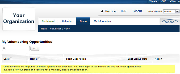 You will be able to review current available volunteer opportunities, if you match the assigned Group and Person Type once set by the administrator.